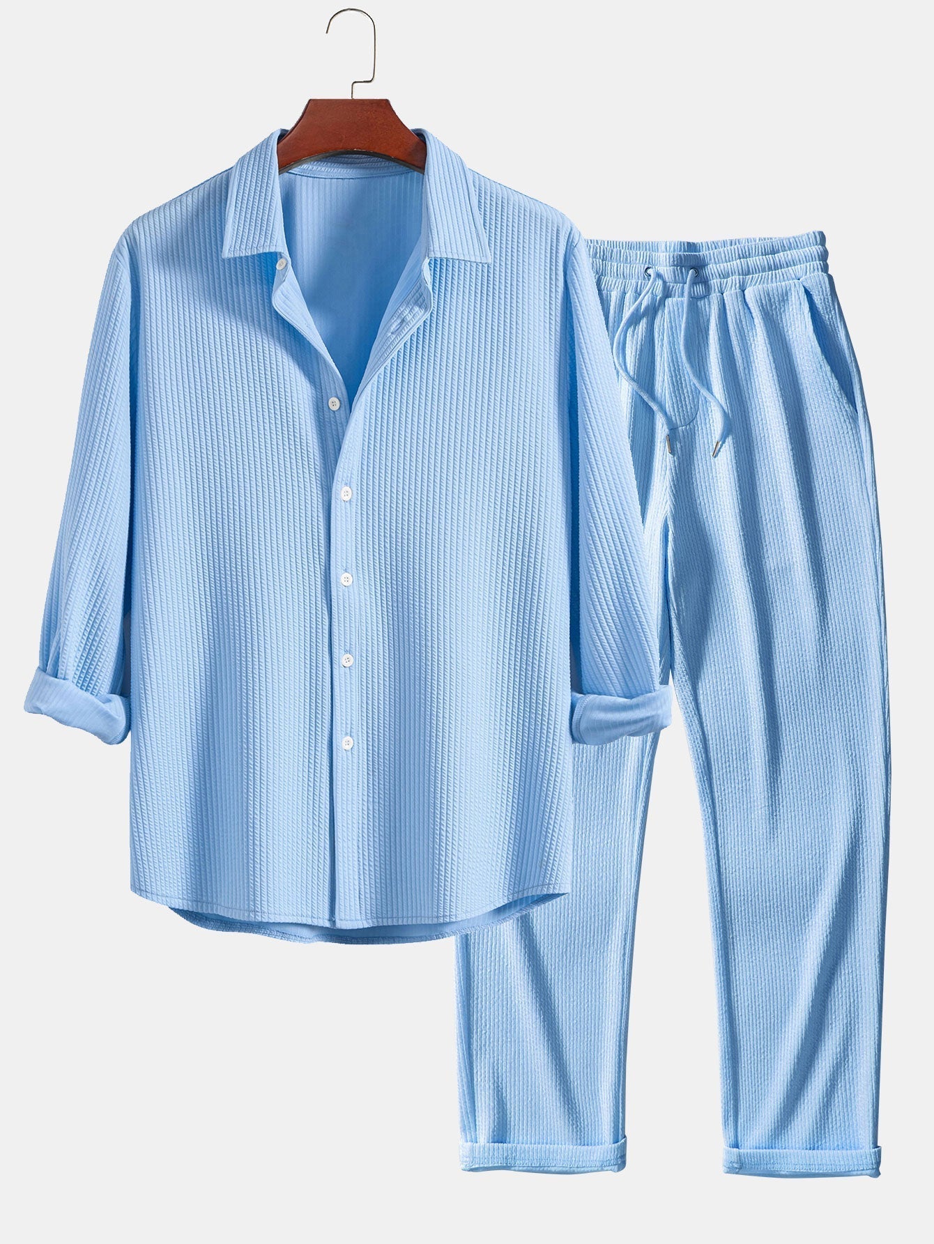 Ribbed Long Sleeve Muscle Fit Shirt, Button-Up & Ribbed Straight Leg Pants