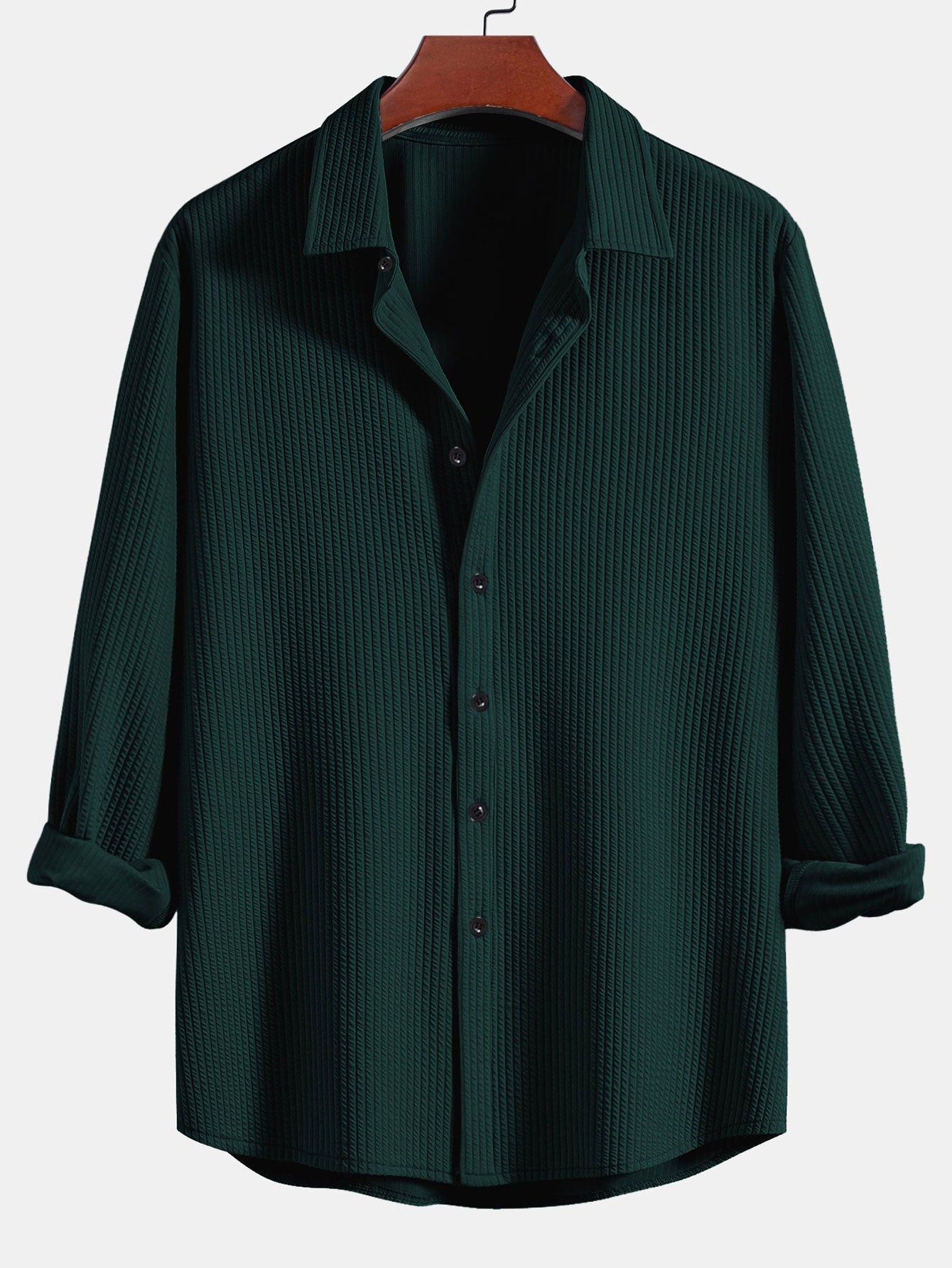 This long sleeve shirt for men is made from a lightweight blue fabric, textured with 3D bubbles for a unique and stretchy feel. Its classic collar design and button placket create a simple yet sophisticated style. Perfect for casual everyday wear, commutes, or vacations, it is comfortable and retains its shape, ensuring a fresh and elegant look.